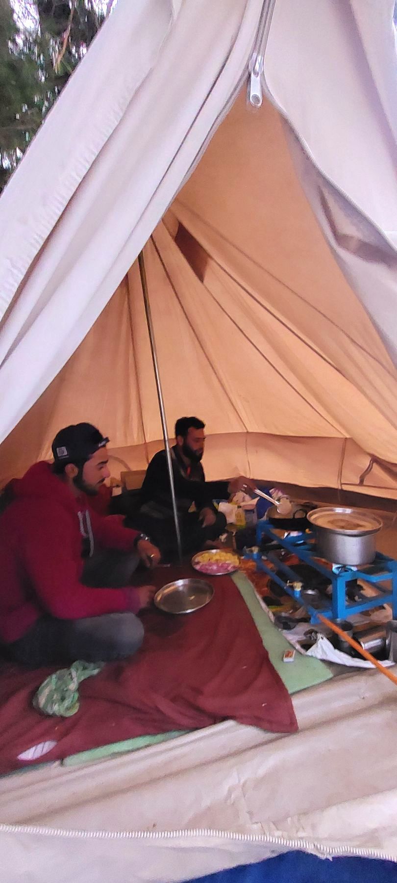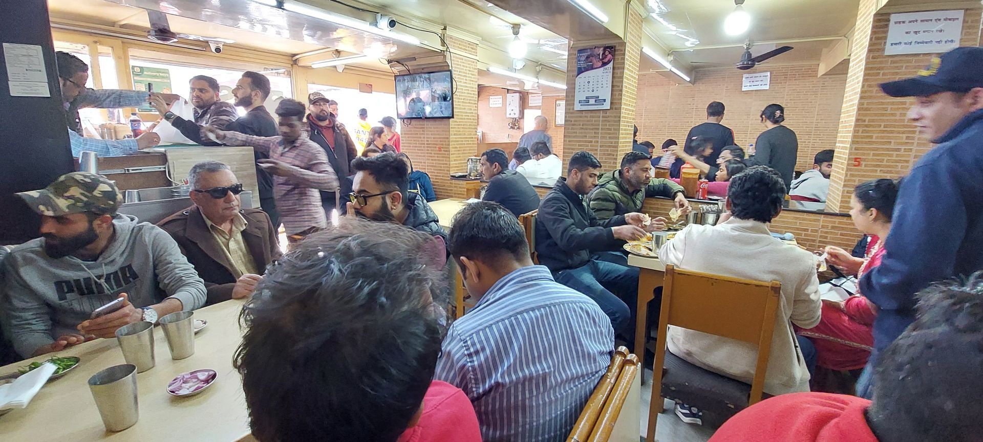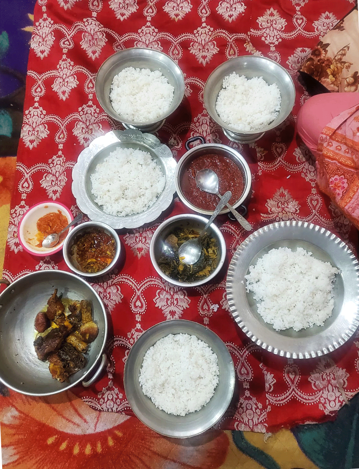 Das Kupfergeschirr mit wunderschönen Verzierungen glänzt silbern. Die Teller heißen Trami, die Schüsseln Donga. Gereicht wird auch eine Schüssel mit Wasser um sich die Hände zu waschen. Auch in Kashmir wird traditionell mit der rechten Hand gegessen. Zum Schluss wäscht man sich wieder die Hände über dem Essensteller mit dem Restwasser und reinigt somit auch den eigenen Teller. Coole Idee!