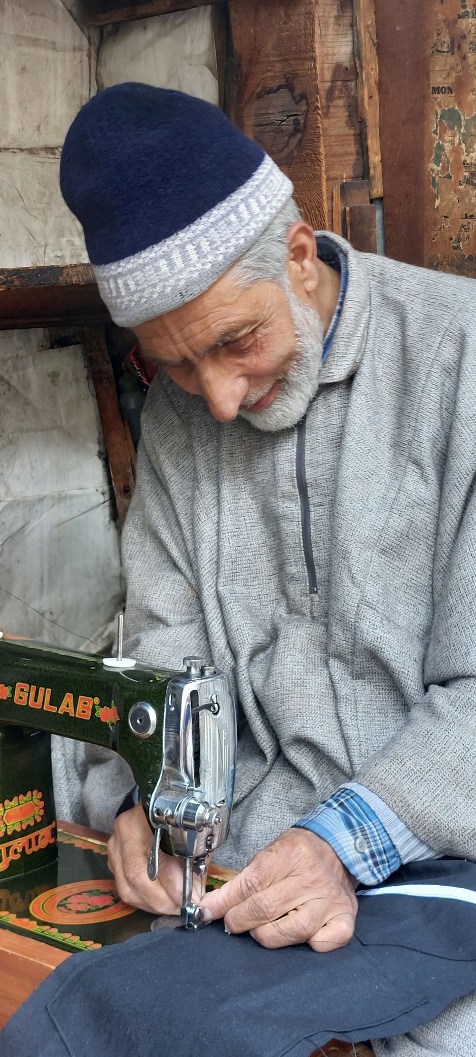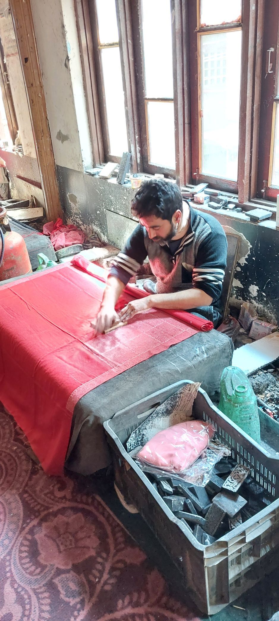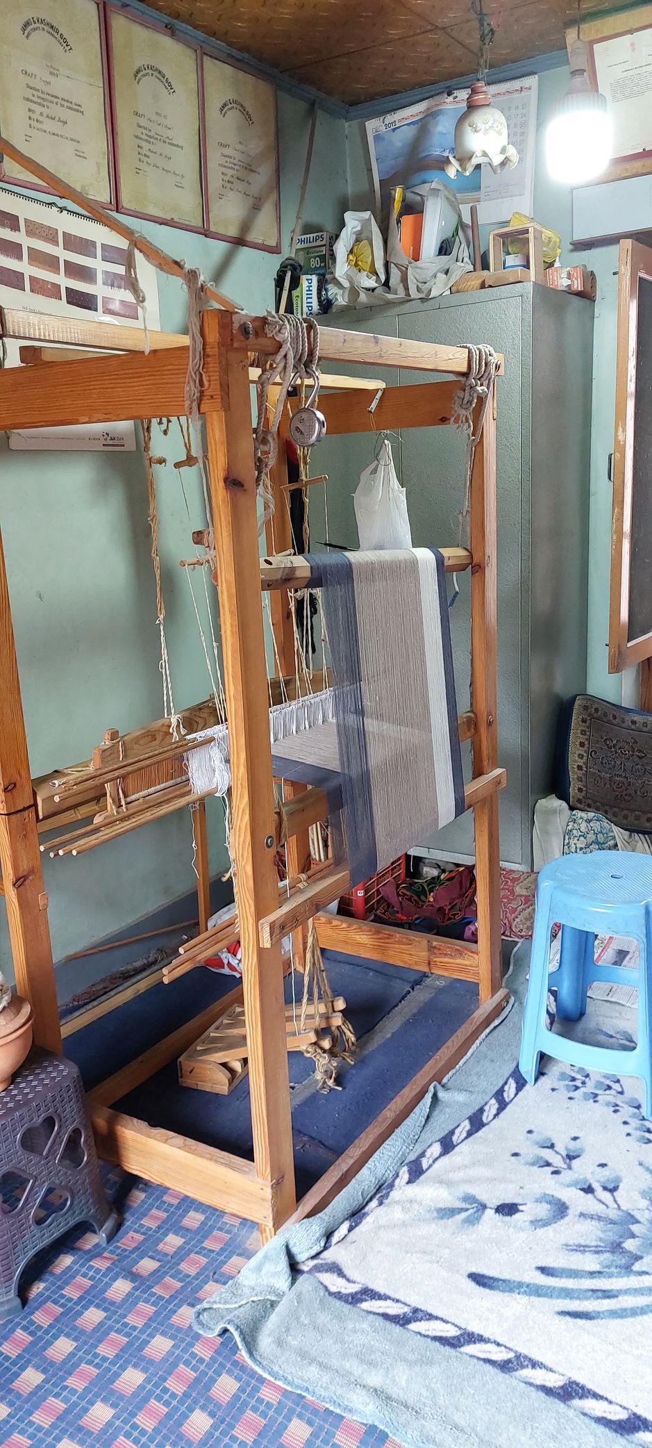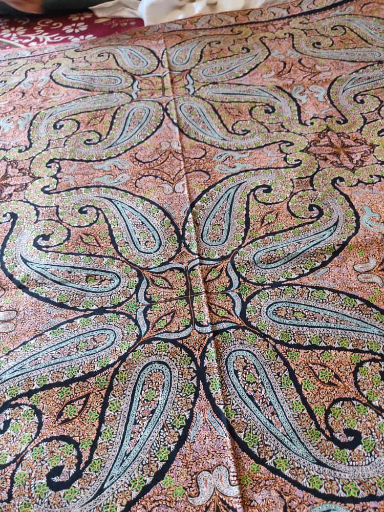 Das Tuch wird in vielen Webereien auch heute noch von Hand gewebt. Das ungefärbte Tuch wird immer in einem natürlichem Gewässer gewaschen. Hier in Srinagar im Fluss Jhelum oder in einem der Seen z.B. dem Dal See. Danach werden die Tücher oft an den mehrstöckigen Häusern zum Trocknen aufgehängt. Später eingefärbt. Und dann in Familienunternehmen mit den aus Walnussholz gefertigten Stempeln bedruckt. Oft werden diese Muster kunstvoll bestickt. Mit feinem Garn und Mininadeln! Diese Arbeit wird immer von Männern durchgeführt. Diese sind Meister ihres Faches. In dem von mir besuchtem Familienunternehmen gab es einen Paschmina Schal, den der Großvater von Amir 5 Jahre lang bestickt hat. Ein englisches Museum hatte Interesse bekundet, diesen außergewöhnlichen Schal zu erstehen. Was daraus geworden ist weiß ich zu diesem Zeitpunkt nicht.