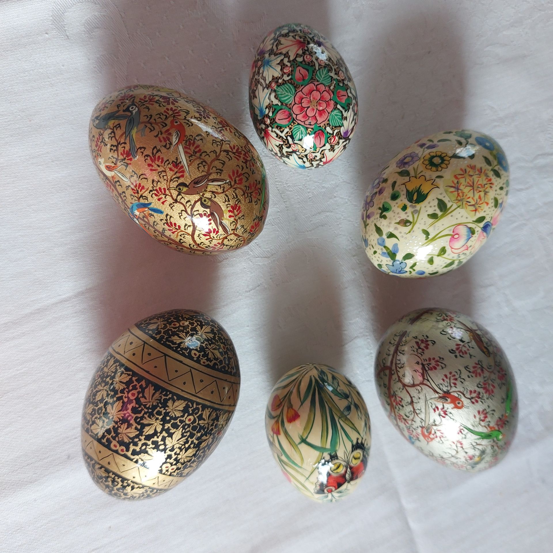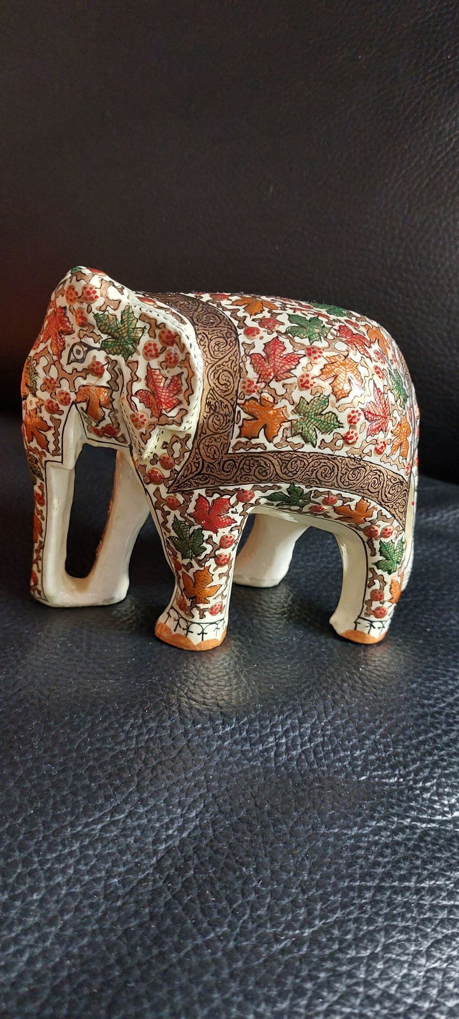 Die Arbeit erfordert größte Konzentration. Für eine große Bodenvase braucht ein Maler etwa neun Monate. Da ja bald Ostern ist, kaufe ich mir verschiede Ostereier mit den Mustern des Lebensbaumes, Naturmotiven und wunderschönen Vögeln. Und einen Elefanten, auch er ist mit den Blättermotiven Kashmirs bemalt.